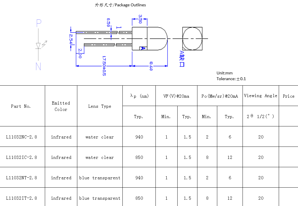 5mm 上圓下方紅外發(fā)射管。特征:紅外輸出功率高,響應(yīng)速度快。應(yīng)用:高速紅外通信,光學(xué)開(kāi)關(guān),光電傳感器,攝像頭,煙霧傳感器