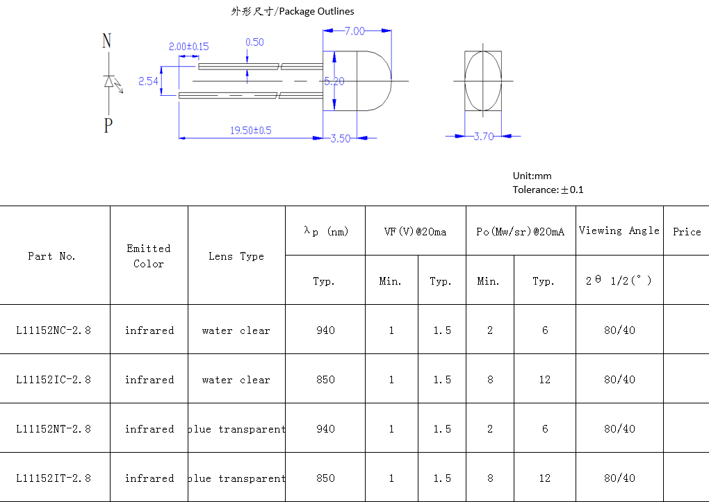 5mm 上橢圓下方紅外發(fā)射管。特征:紅外輸出功率高,響應(yīng)速度快。應(yīng)用:高速紅外通信,光學(xué)開關(guān),光電傳感器,攝像頭,煙霧傳感器