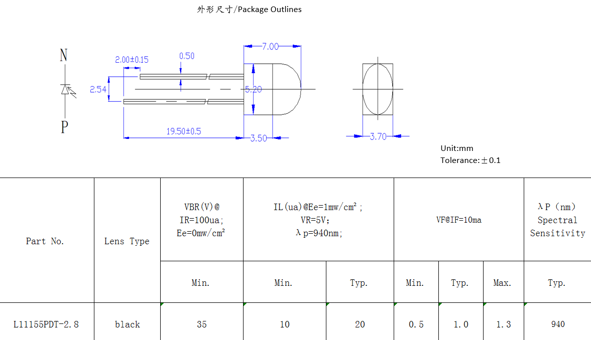 5mm上橢圓下方紅外發(fā)射管。特征:紅外輸出功率高,響應(yīng)速度快。應(yīng)用:高速紅外通信,光學(xué)開關(guān),光電傳感器,攝像頭,煙霧傳感器