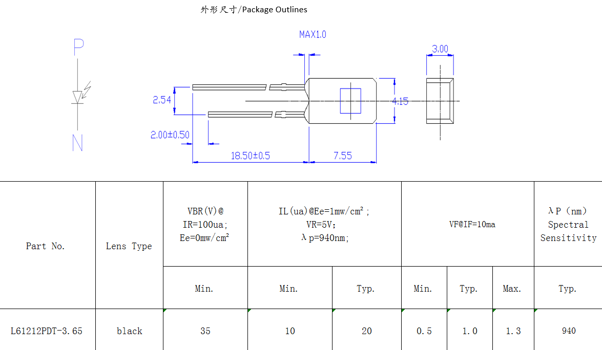 側(cè)面紅外接收管。特征:紅外輸出功率高,響應(yīng)速度快。應(yīng)用:高速紅外通信,光學(xué)開(kāi)關(guān),光電傳感器,攝像頭,煙霧傳感器