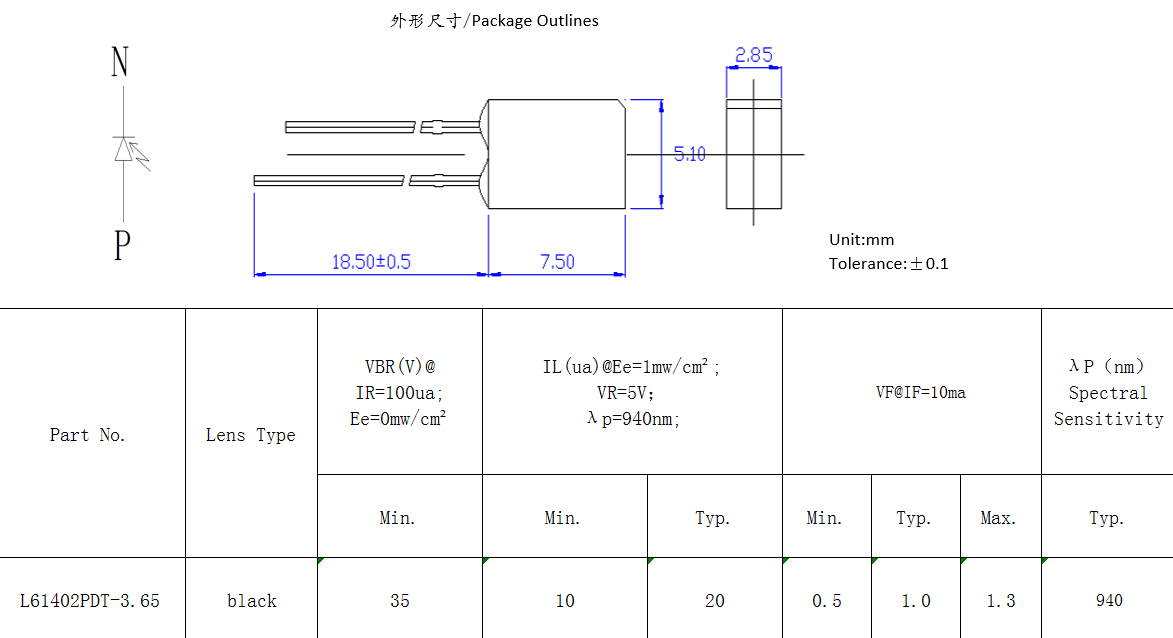 側(cè)面紅外接收管。特征:紅外輸出功率高,響應(yīng)速度快。應(yīng)用:高速紅外通信,光學(xué)開關(guān),光電傳感器,攝像頭,煙霧傳感器