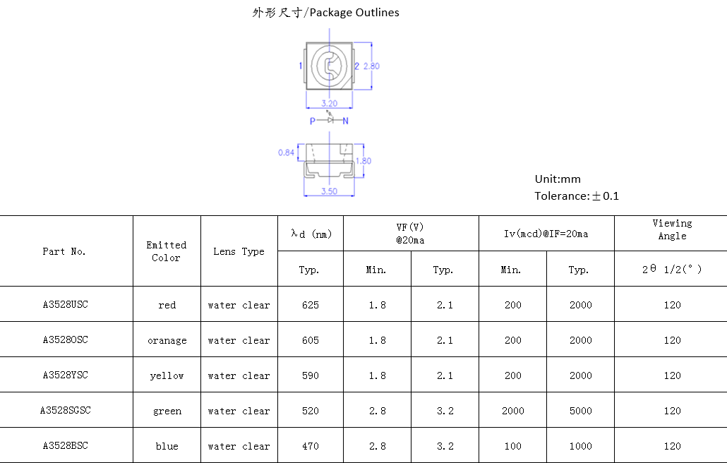 3.5mm(長(zhǎng))*2.8mm(寬)*1.8mm(厚) 特征:低光衰,低能耗。應(yīng)用:裝飾照明,家居照明,背光燈,按鍵指示