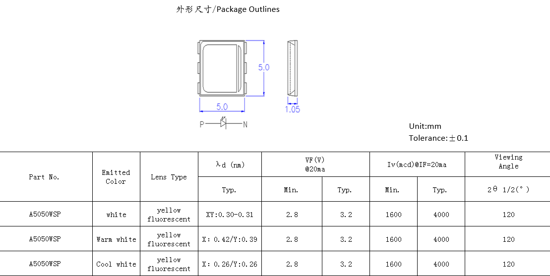 5.0mm(長(zhǎng))*5.0mm(寬)*1.05mm(厚)特征:低光衰,低能耗。應(yīng)用:裝飾照明,家居照明,背光燈,按鍵指示